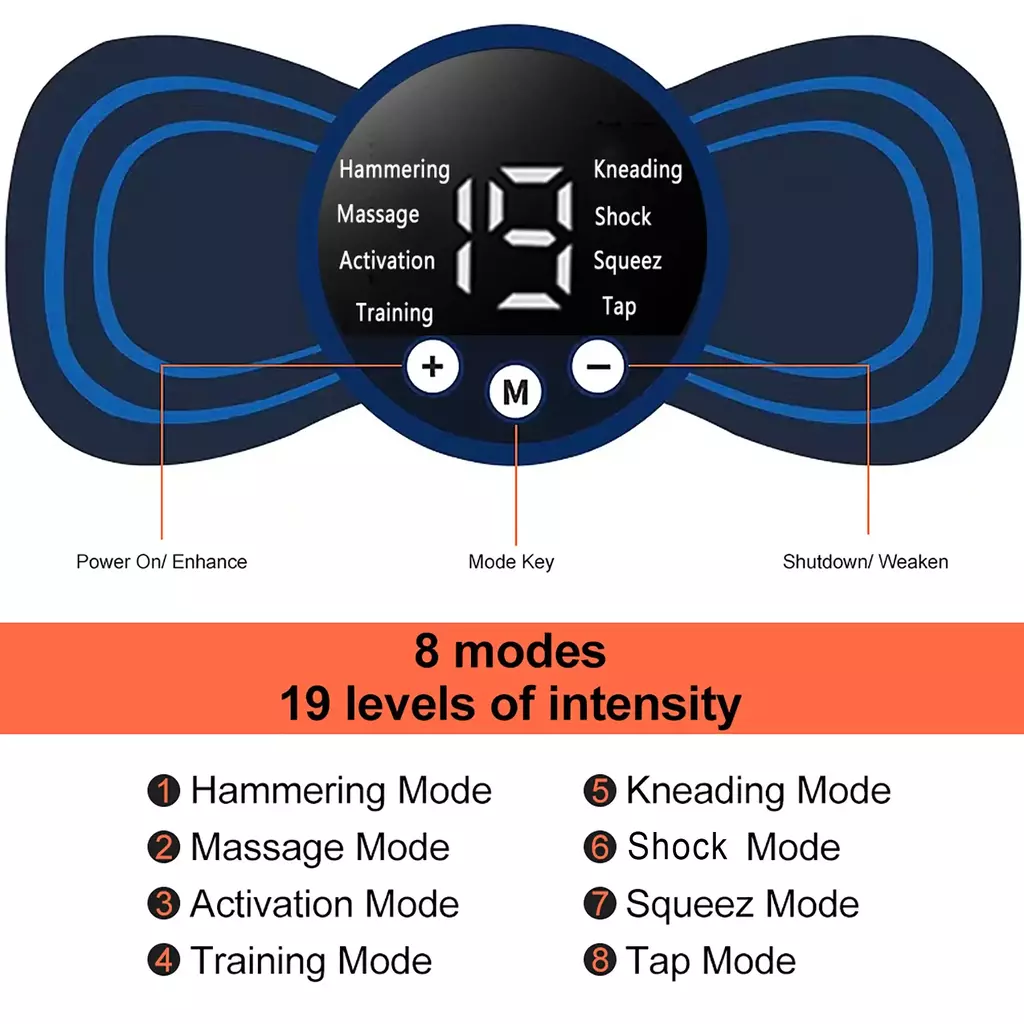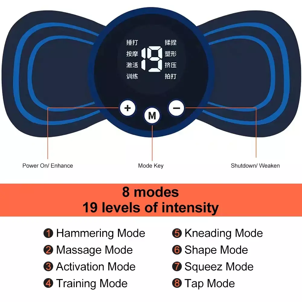 3.8 modes & 19 Levels: There are different intensity levels for each mode (Tapping, massage, massage, squeezing, tapping, kneading, training, shaping) Users can choose different intensities according individual needs.